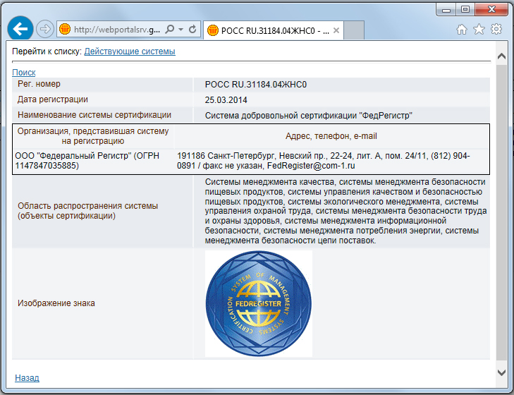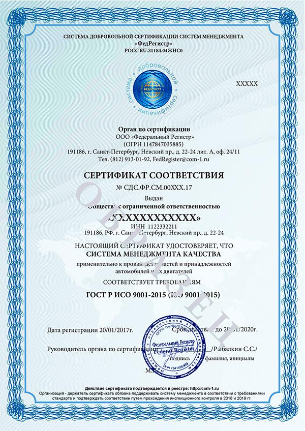 Сертификат выданный органом по сертификации Федеральный Регистр - стоит 47 000 рублей и действует 3 года, выдается с шаблонной документацией. Орган по сертификации обязан каждый год проводить инспекционный контроль (ГОСТ Р ИСО/МЭК 17021).