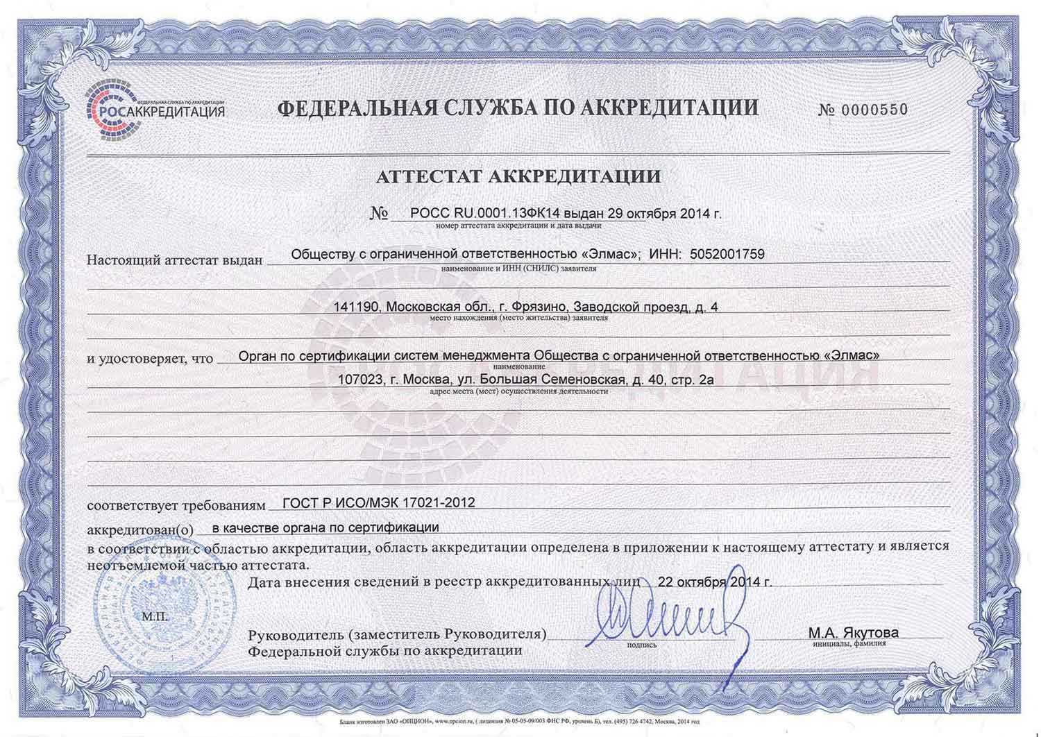 РОСАККРЕДИТАЦИЯ. Наличие аттестата аккредитации означает официальное признание центра по сертификации отвечать требованиям заказчика. Аттестат можно проверить на сайте fsa.gov.ru Работаем при координации "Элмас".